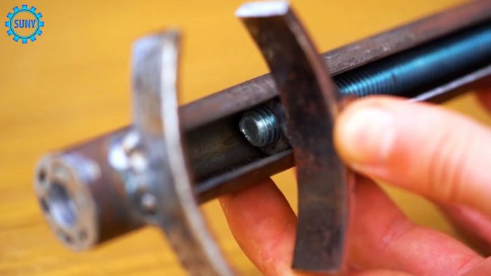 Далее вставляется длинная резьбовая шпилька и вкручивается через скользящую гайку.
