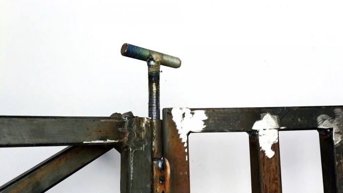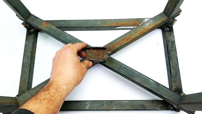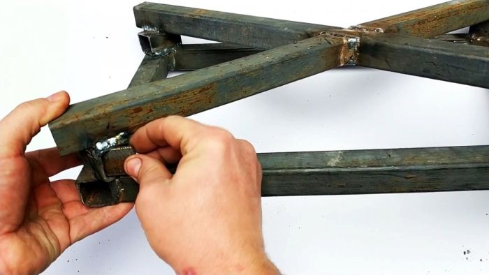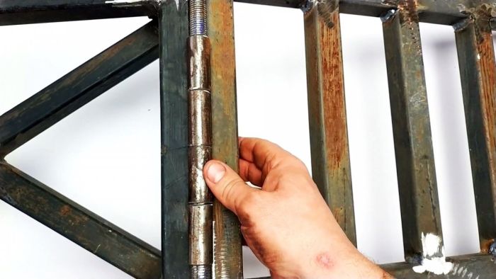 После этого нужно соединить эстакаду с рамкой. Для этого нарезается 4 отрезка трубы по 5 см для изготовления петель. Они надеваются на резьбовую шпильку, затем половина из них привариваются к эстакаде, а остальные к рамке. На краю шпильки можно сделать ручку, чтобы иметь возможность ее легко вынимать.