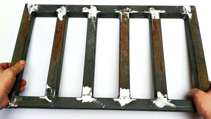 Из труб длиной 50 см и 33 см сваривается рамка для заезда на эстакаду. В нее ввариваются 4 перемычки.