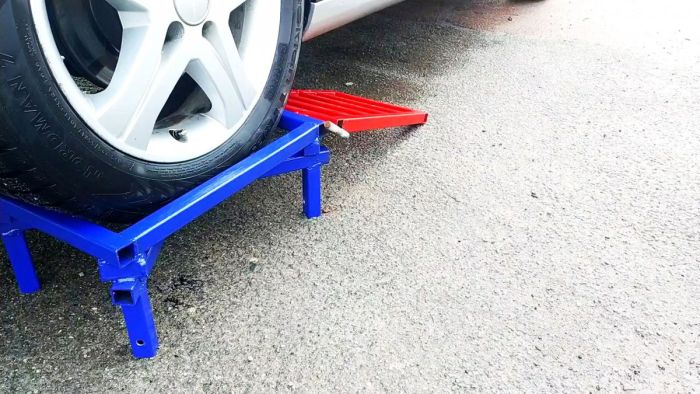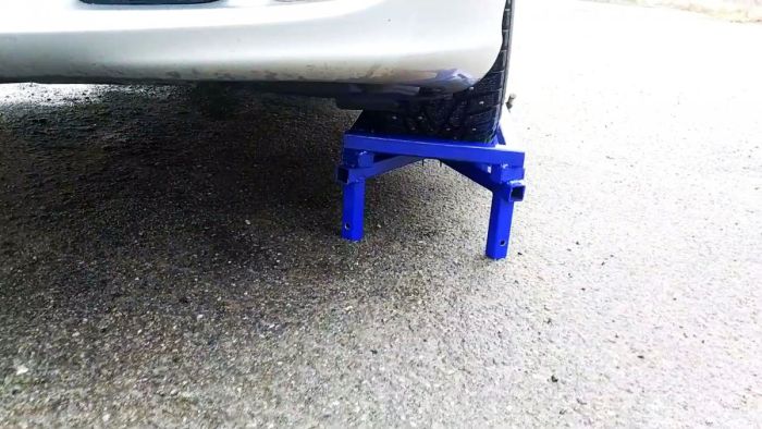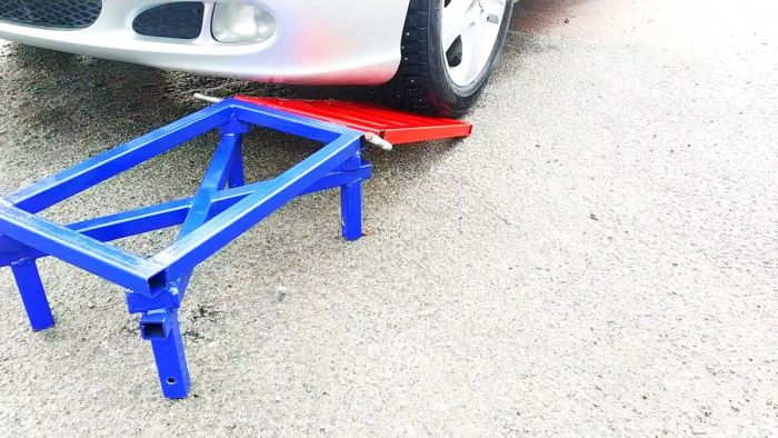Нужно изготовить пару, а лучше 4 эстакады. Они ставятся перед колесами, и машина заезжает наверх. Затем можно убрать съемные рамки, чтобы они не мешали работать, а перед съездом поставить их обратно.