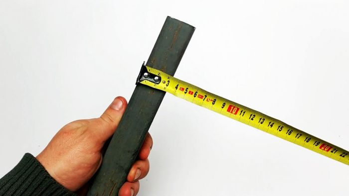 Из трубы 30х30 мм нарезается 4 заготовки по 15 см, чтобы сделать ножки эстакады. Они будут приварены под прямым углом к пересекаемым диагоналям. Из трубы 20х40 мм нужно отрезать кусок 6 см и вырезать у него одну широкую стенку.