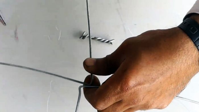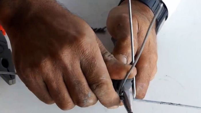 Далее кладем один угол на другой с нахлестом в 1 сантиметр и зажимаем все плоскогубцами. Теперь навинчиваем один кусок проволоки на другой. Начинаем руками.