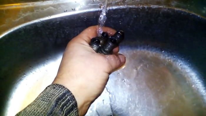 И так, приступим к очистке свечей от годовалого нагара. Предварительно промоем их под струей проточной воды.