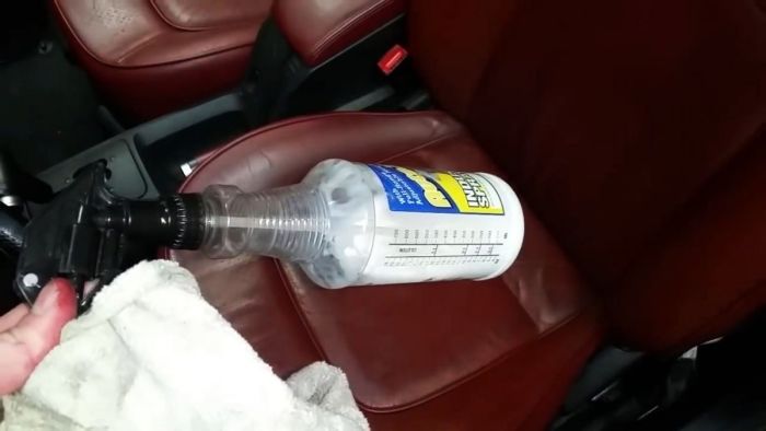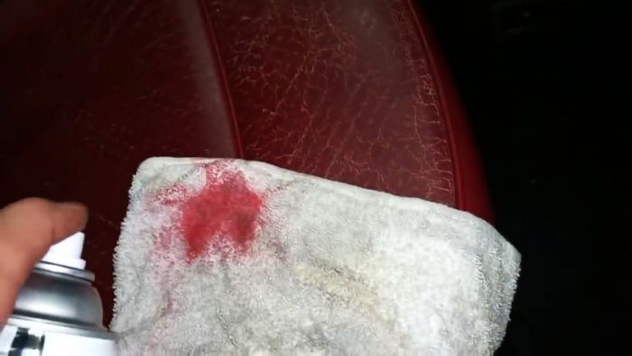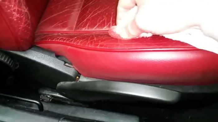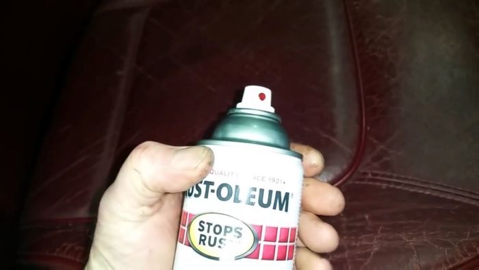 Чтобы скрыть белые трещинки на коже, их нужно закрасить. Для этого используется обычная аэрозольная краска. Можно срезать для образца небольшой лоскут кожи на обратной стороне сидения, и в магазине подобрать краску в этот тон.