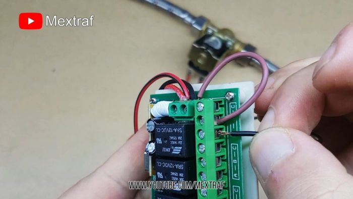 Далее подключим клапан к плюсу блока и выхода от разомкнутых контактов реле.