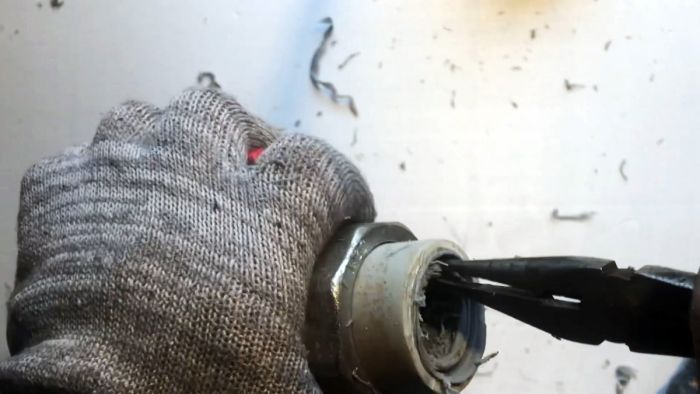 Впаянный фитинг нужно отрезать ножницами от трубы. Рез делается впритык к нему.