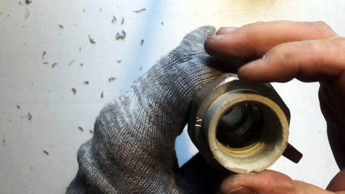 Затем требуется срезать тонкую кромку с наплывами от пайки. Далее используя фаскосниматель. Необходимо расширить внутренний диаметр фитинга с впаянной трубкой, чтобы в него могла войти насадка паяльника.