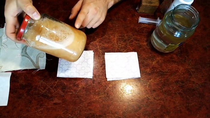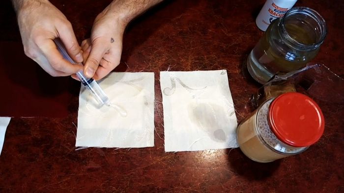 Для обработки, нужно окунуть ткань в мыльный раствор и высушить ее. Затем она замачивается в квасцах и снова сушится. После этого ткань немного потемнеет, но станет водонепроницаемой, при этом она сможет пропускать воздух.