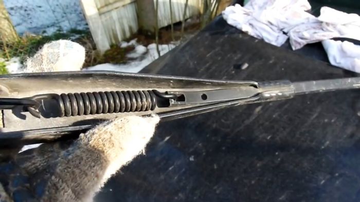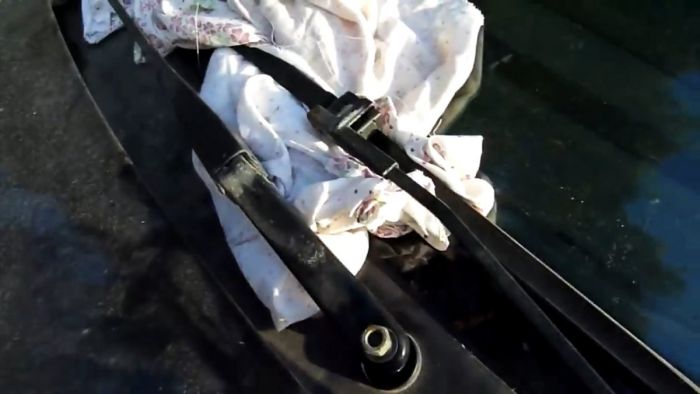 С прослабленного дворника снимается колпачок, и отпускается гайка. Под него по всей длине подкладывается ветошь, чтобы защитить стекло. Чтобы сорвать его со шлицов, нужно потянуть одной рукой в начале поводка, а второй ладонью нанести удар по поводку немного дальше. В результате тот сойдет со шлицов.