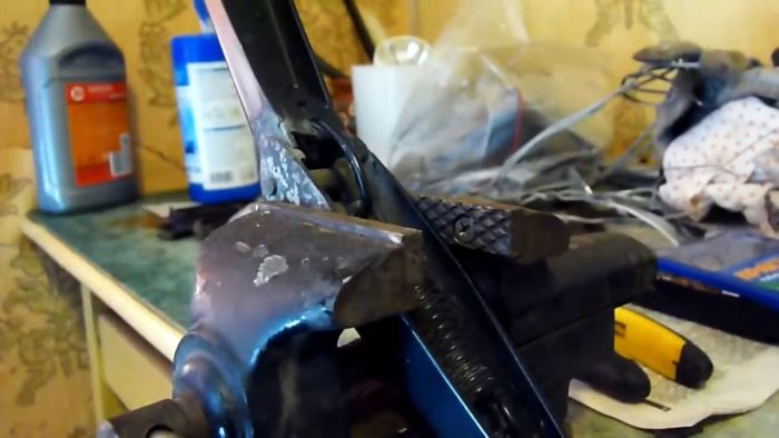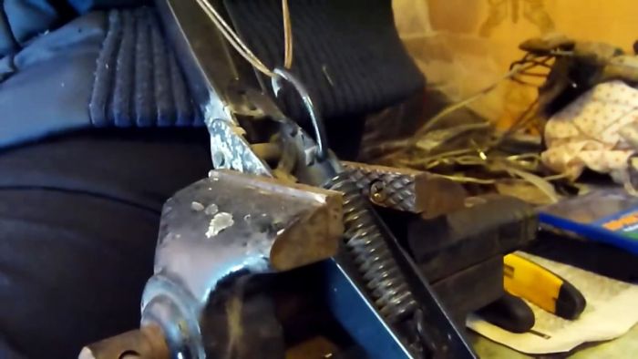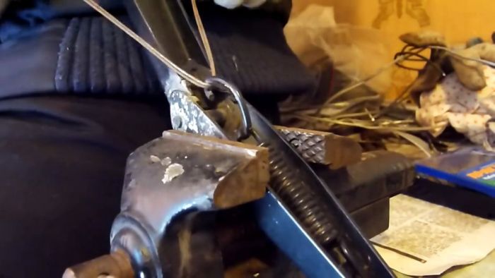 Для усиления прижима нужно подцепить проволокой пружину из обратной стороны поводка. Для этого тот фиксируется в тисках.