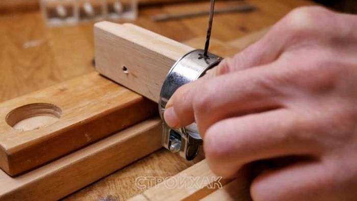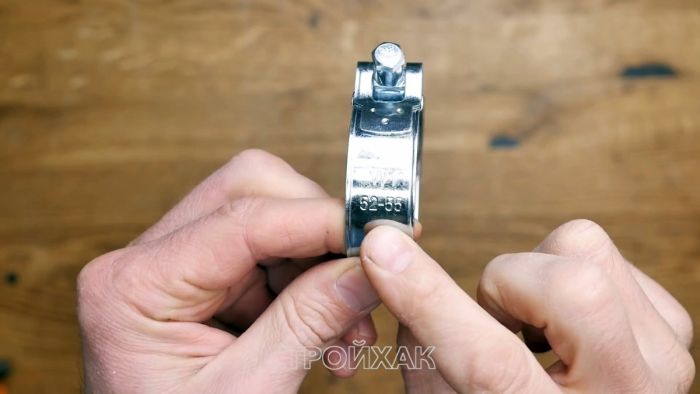 В подготовленном хомуте просверливается отверстие 8 мм. Заусенцы убираются напильником. В хомут изнутри вставляется ниппель.