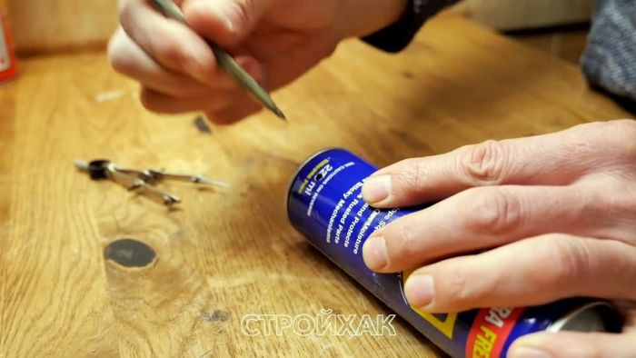 В пустом баллоне от WD-40 необходимо пробить отверстие прямо по центру цифры «0» надписи указывающей объем.