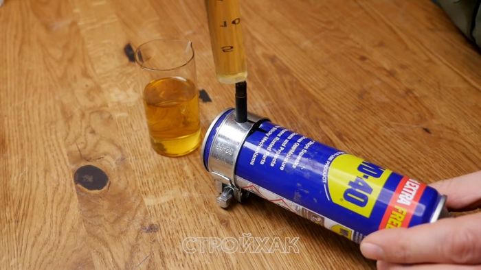 Дальше готовится сам аналог WD-40. Для этого на 3 части керосина или уайт-спирита добавляется 1 часть машинного масла. Смесь заливается в баллон через ниппель шприцем. Для этого придется выкрутить золотник.
