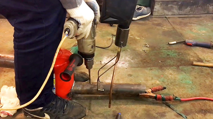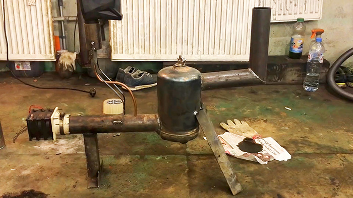 К каналу подачи воздуха приваривай крепление для бачка с переработкой. Он представляет собой кусок трубки с ножками из проволоки или арматуры.