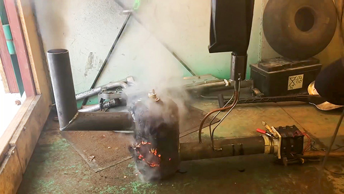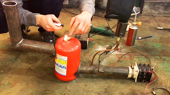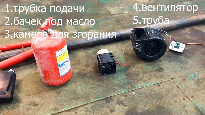К печке подсоединяется кулер, лучше всего 3 шт., в огнетушитель забрасывается подожженная вымоченная в солярке тряпочка через горловину, затем заливается отработка в бак. В результате произойдет горения масла.