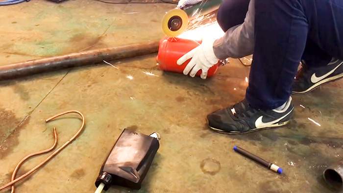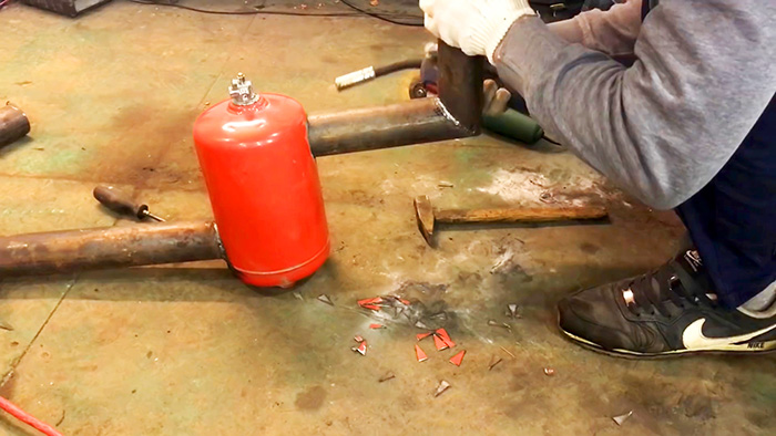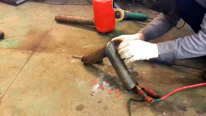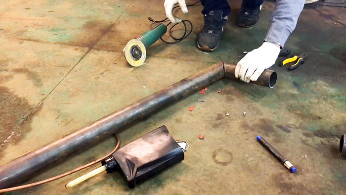 Сверху вваривается дымоход. Для этого трубы подрезаются под 45°, и соединяется под прямым углом.