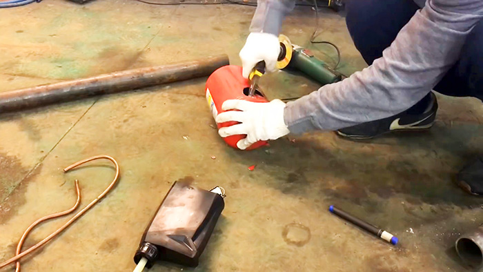 В огнетушителе необходимо вырезать 2 отверстия для подачи воздуха и отвода дыма. Одно проделывается у дна, второе с противоположной стороны сверху.