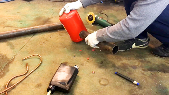 При первом пуске печка будет сильно дымить, пока не выгорит краска на огнетушителе. Когда это произойдет, к ней можно приварить ножки.