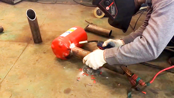 Ближе к огнетушителю в воздушной трубе сверлится отверстие под подачу топлива. В него вставляется медная трубка. Ее нужно выгнуть, и проложить до крепления, чтобы соединить с бачком.