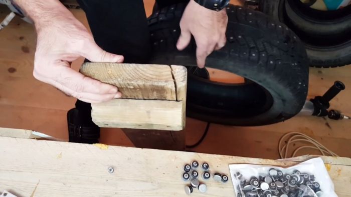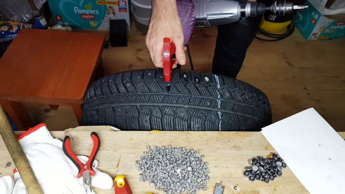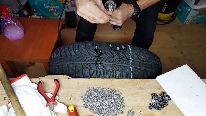 Из шин необходимо вытащить пустые обоймы от утерянных шипов. Они вырываются тонкогубцами. Если обойма утопилась глубоко, она вытягивается отверткой. Попутно необходимо извлечь камушки, застрявшие в протекторе.