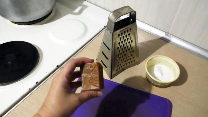 Необходимо вскипятить воду в емкости. В нее на каждые 5 л кипятка засыпается 250 гр. соды и пол бруска натертого на терке хозяйственного мыла.