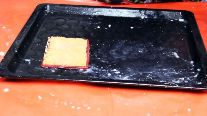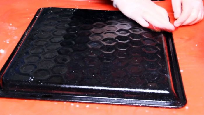Противень сначала очищается от застывшего жира, если тот имеется.