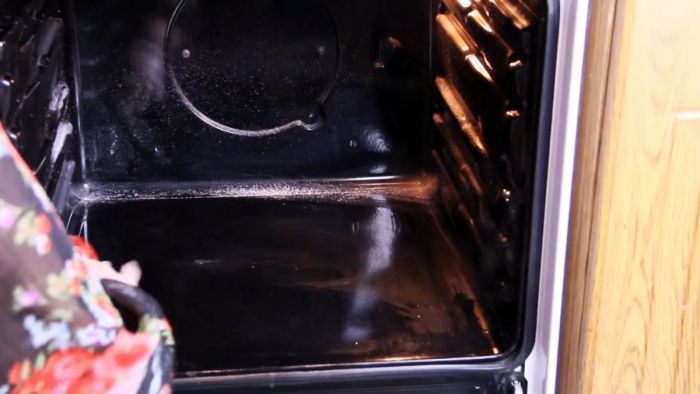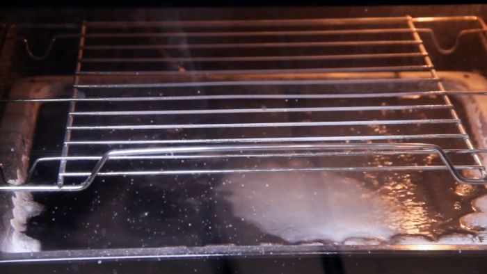 За счет испарений от противня размягчается и нагар на стенках духовки. Ее достаточно будет стереть губкой в уксусе.