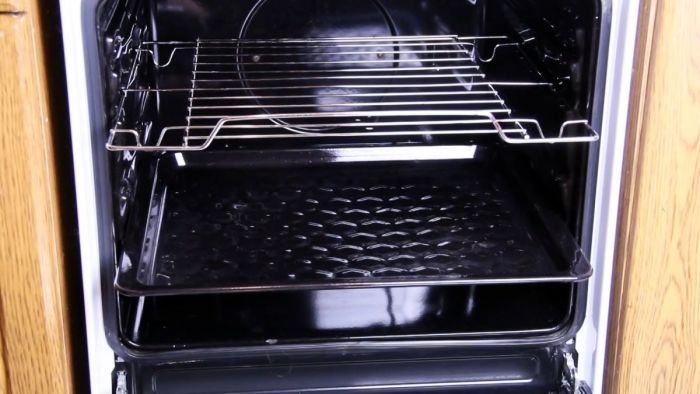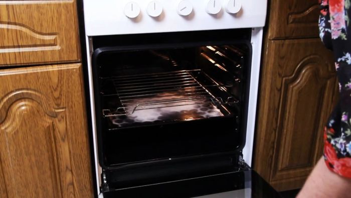 Противень устанавливается в духовку. Сверху него можно поставить решетку, если она также испачкана.