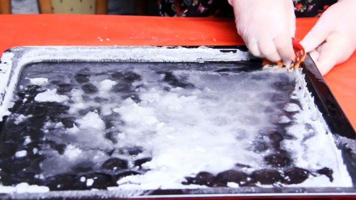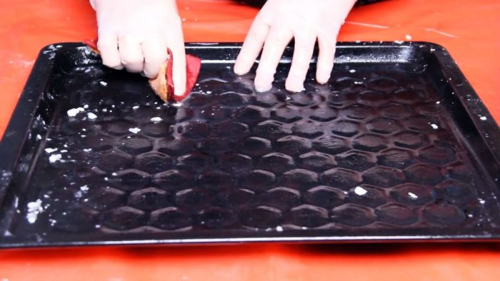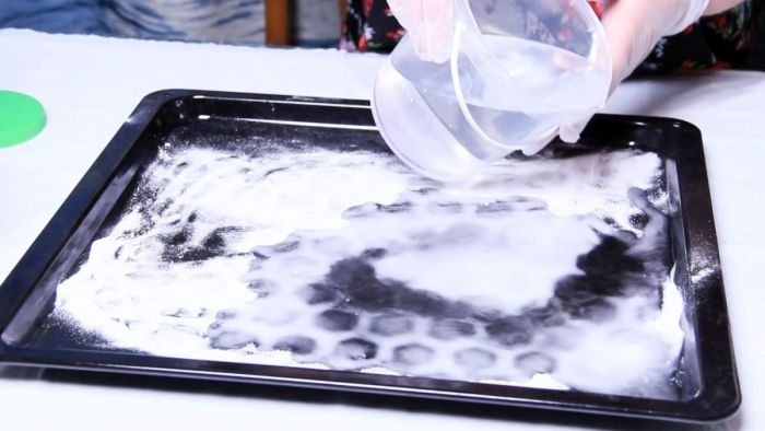 Нагар на противне сойдет вместе с коркой соды. Оставшиеся размягченные пятна можно стереть губкой, используя в качестве абразива соль.