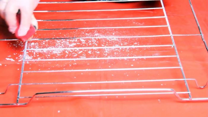 Когда вода станет теплой, можно открыть духовку и вытащить противень с решеткой. Последнюю нужно просто протереть от белого налета соды. Он отвалится вместе с нагаром. Останется только протереть решетку тряпочкой смоченной в уксусе, чтобы она заблестела как новая.
