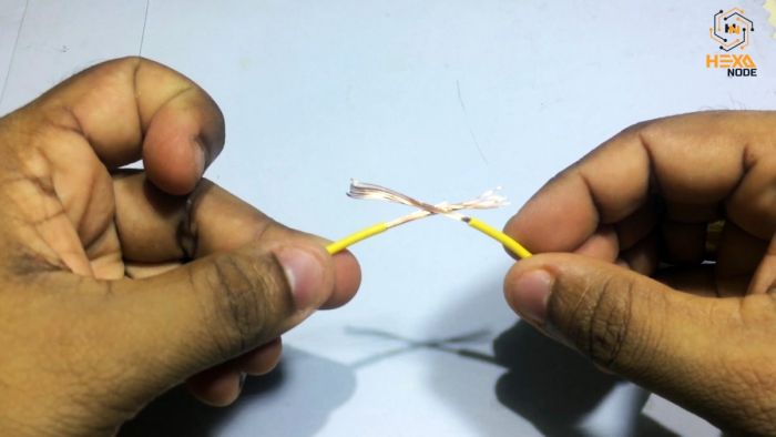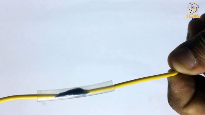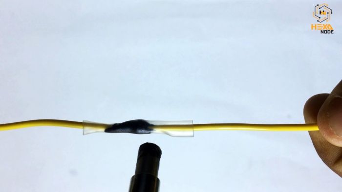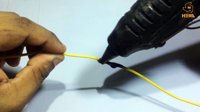 На скрутку наносится термоклей. Нужно его равномерно распределить, полностью закрыв оголенные жилы.