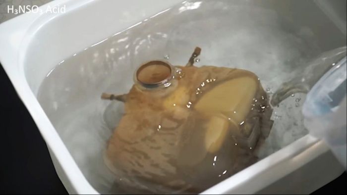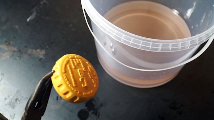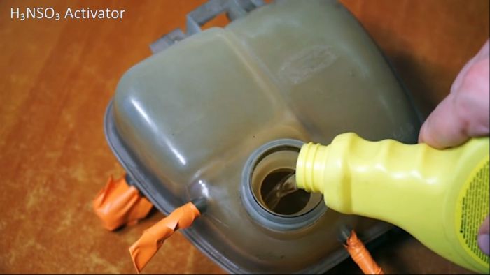 Изолента и крышка бачка снимаются, и он погружается в раствор сульфаминовой кислоты.