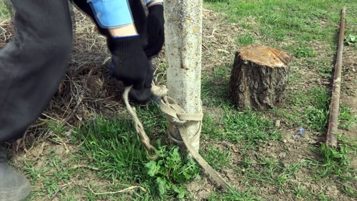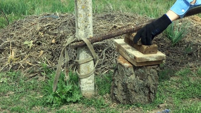 Внизу столба завязывается веревка. Она складывается пополам, затем с нее делается петля и затягивается на столбе. После этого ее края обводятся вокруг него и связываются между собой, чтобы сделать проушину под рычаг.