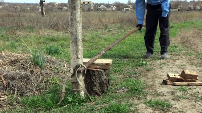 Как только столбик частично выйдет, под рычаг на колоду подкладываются короткие дощечки, и все повторяется. Когда подставки потеряют устойчивость, нужно распустить петлю и опустить веревку вниз.
