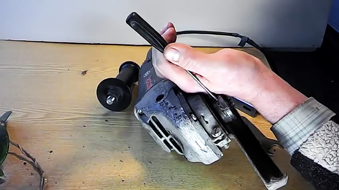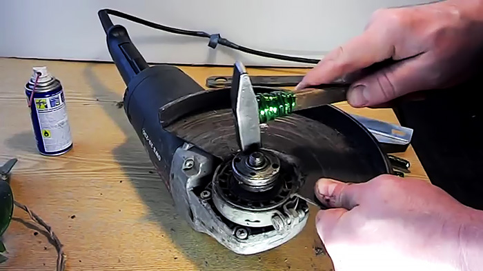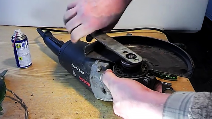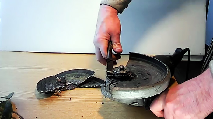 При работе с тонким отрезным диском может случиться ситуация, когда тот ломается на высоких оборотах. В результате этого гайка на шпинделе зажимается настолько сильно, что раскрутить ее ничего не разломав невозможно. Разберем способ, как можно выйти из ситуации.