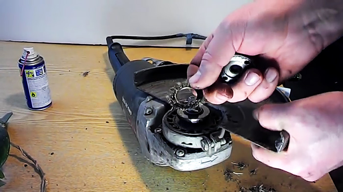 Абразивную часть сломанного диска нужно выломать плоскогубцами. Затем стоит задача убрать его ошметки между гайками на шпинделе, оставив только металлическое кольцо.