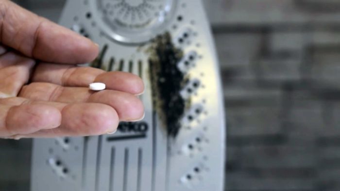 Как только утюг разогрелся, таблеткой начинаем очищать нагар.