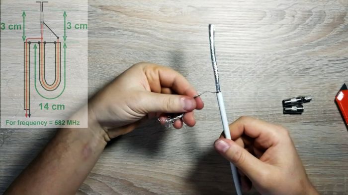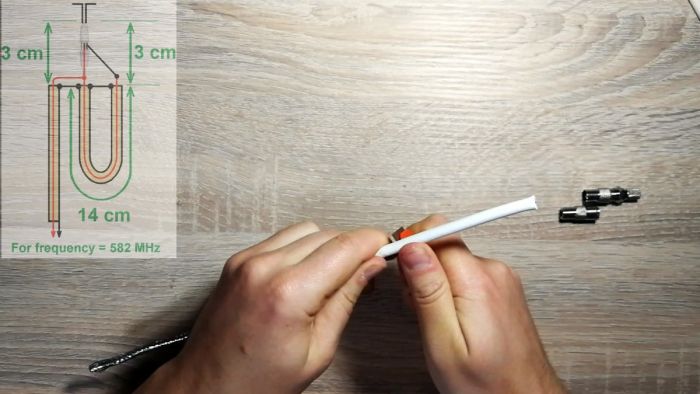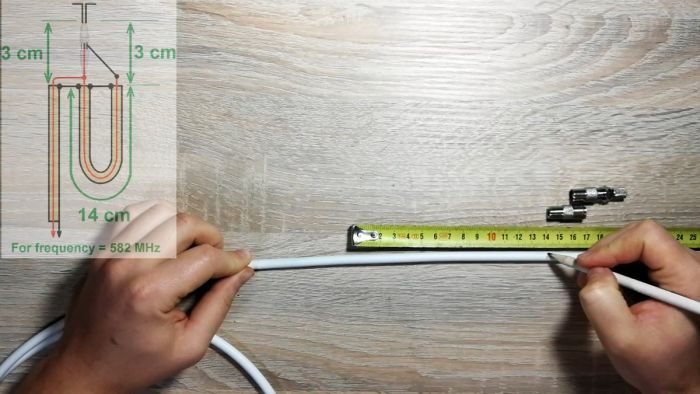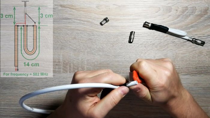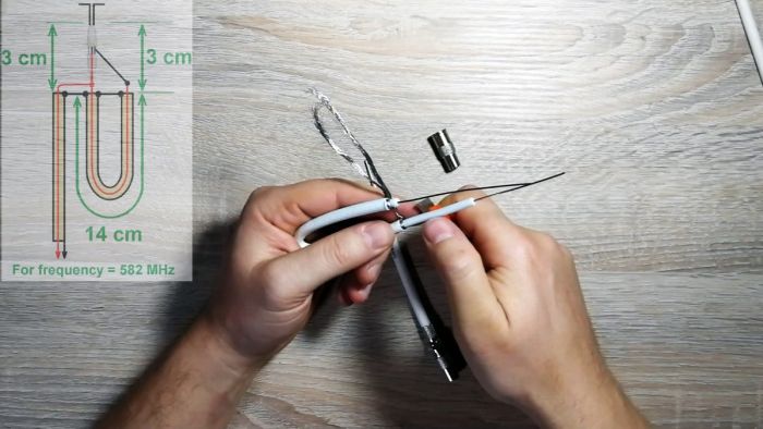 Необходимо взять отрезок коаксиального кабеля длиной 30-35 см.