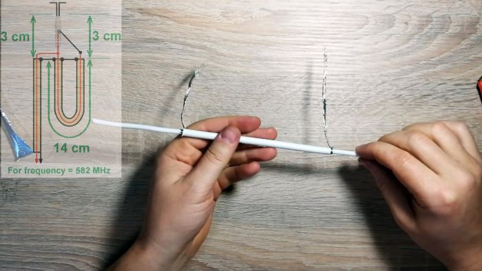 В его центре отмечается отрезок 14 см, из которых будет сформирована петля. От него с боковых хвостов снимается первый слой изоляции. Нужно размотать оплетку и сорвать фольгу.