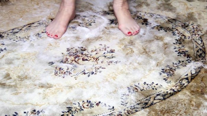 В пропорции 1:1 смешиваются пищевая сода и соль. Они равномерно высыпаются на ковер и слегка втираются в него стопами, ладонями или сухой щеткой.
