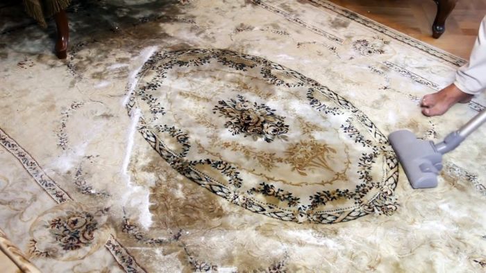 Чистящая смесь остается как минимум на 30 минут, но лучше на всю ночь. После этого ковер тщательно пылесосится.