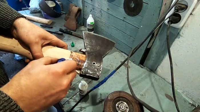 Далее набивается топорище, как и обычно. При этом часть, входящая в проушину, предварительно смазывается клеем ПВА.