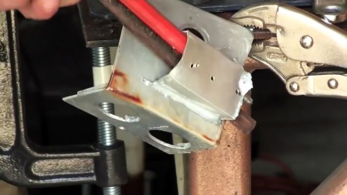 Детали для пайки нужно зачистить щеткой по металлу. Она снимет грязь, окись, а также создаст нужную для прихватывания припоя шероховатость. Детали стыкуются между собой и по возможности фиксируются в тисках или прижимаются.