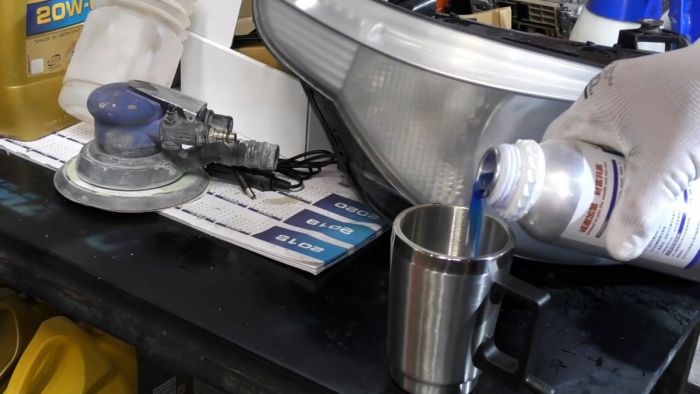Первым делом фара шлифуется наждачной бумагой вручную или машинкой. Нужно снять верхний защитный слой от ультрафиолета, и добраться до оргстекла. Начать можно с абразива Р400 или Р600, и постепенно перейти на более мелкую шкурку.