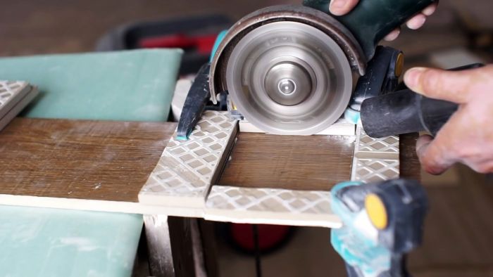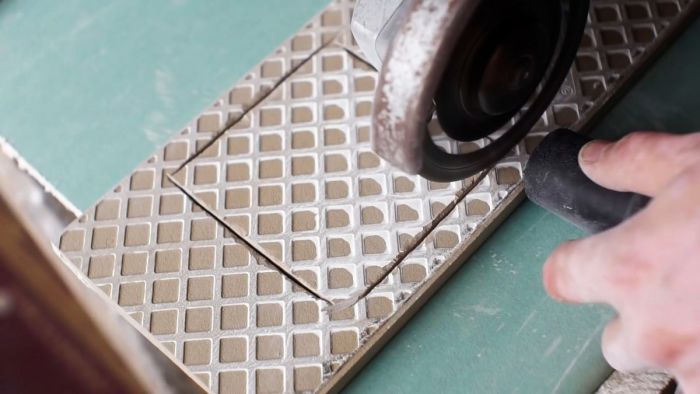 Трап или кнопка отрывается, и делается рез болгаркой по лицевой стороне вплотную к обрезкам. Необходимо прорезать плитку насквозь с каждой стороны. При этом диск должен доходит до углов разметки, не дальше.