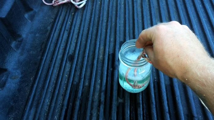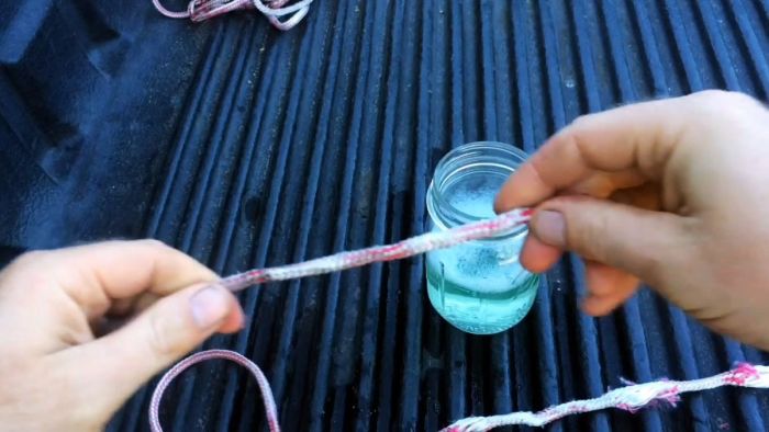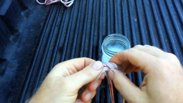 Нужно подождать пока веревка полностью пропитается. Узел можно вытаскивать после окончания выхода пузырьков воздуха. Далее его необходимо потереть между ладонями, чтобы немного растянуть волокна.