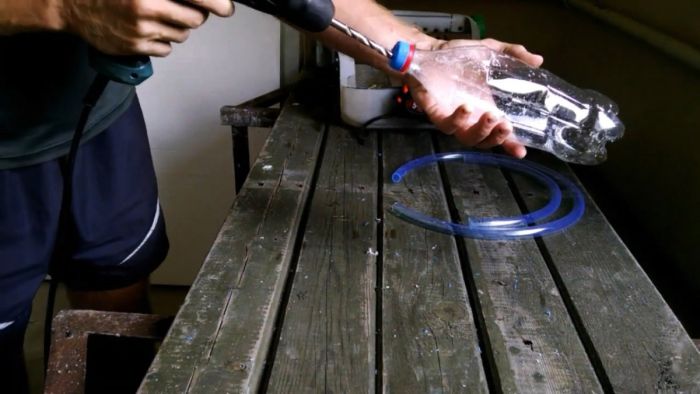 В дне бутылки и крышке просверливаются или прожигаются отверстия чуть меньшие наружного диаметра шланга.