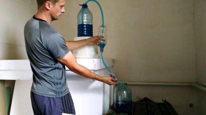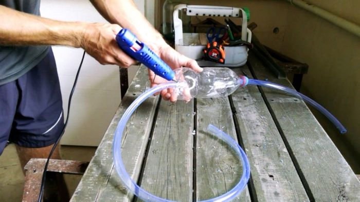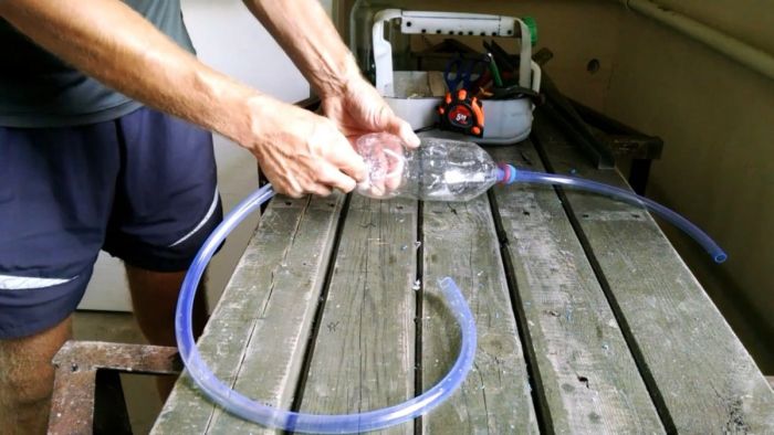 Теперь опустив один шланг в емкость, и перекрыв второй пальцем, можно сжимая бутылку закачать жидкость.
