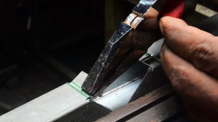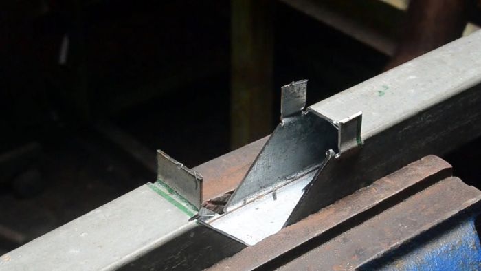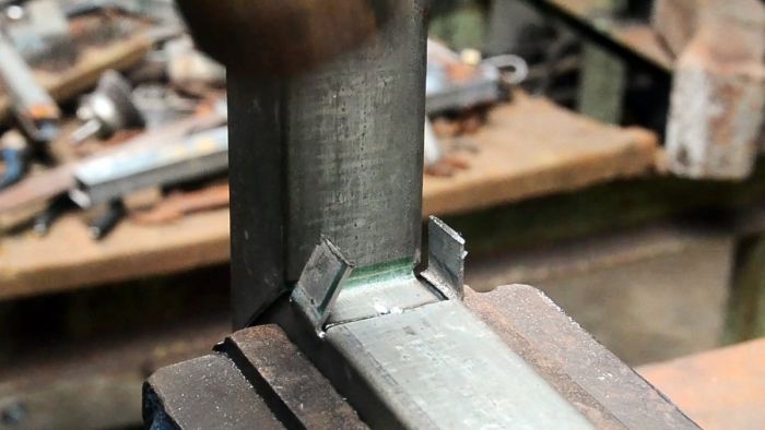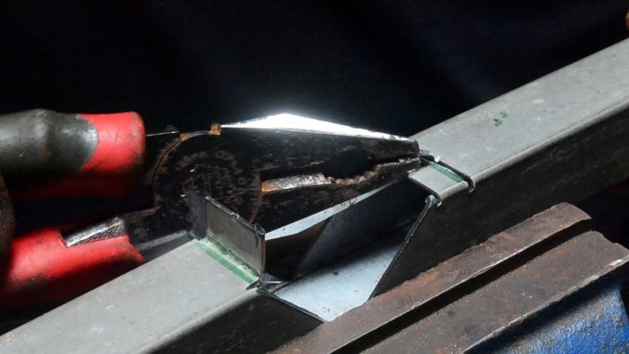 Далее труба сгибается под прямым углом, и ее язычок прижимается усиками, которые возвращаются в изначальное положение. Все надежный жесткий угол готов.