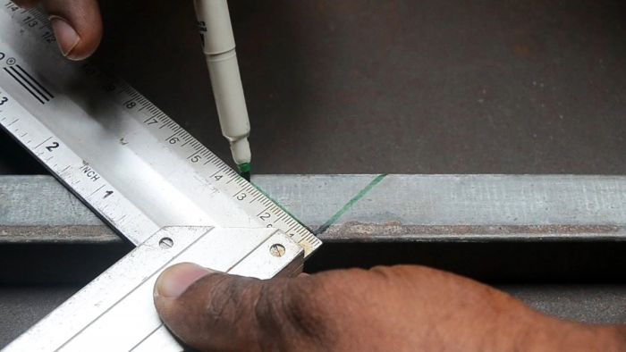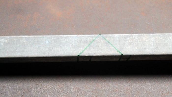 По бокам трубы нужно начертить по прямому углу, устанавливая угольник под 45°.